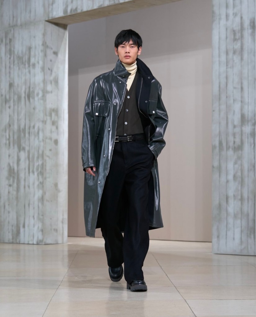 Le défilé s’est tenu dans un décor minimaliste qui mettait en avant les vêtements, accentuant ainsi l’attention sur les détails et les coupes. Les mannequins ont défilé dans une ambiance chaleureuse et contemporaine, soulignant l’aspect intemporel de chaque création.