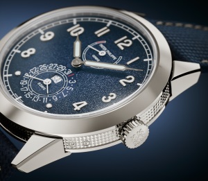 La montre est montée sur un bracelet en cuir de veau bleu marine avec motif textile, assorti d’une boucle déployante brevetée à trois lames en or blanc, garantissant un confort optimal au poignet.