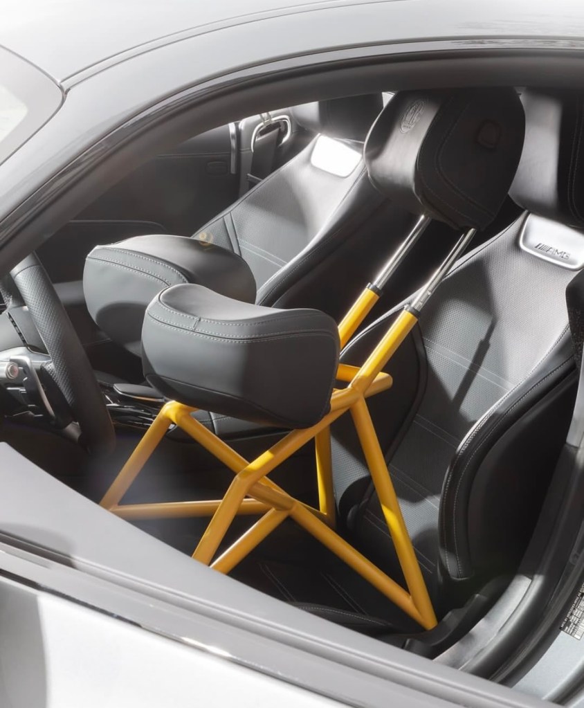 Exit la voiture. Ici, les composants AMG ne servent plus à faire rugir les moteurs, mais à meubler nos imaginaires. Sièges ergonomiques façonnés à partir de châssis, lampes de sol construites à partir de pièces de suspension, poubelles sculpturales à base d’échappements : chaque création joue sur l’ironie, sans jamais tomber dans la parodie facile.