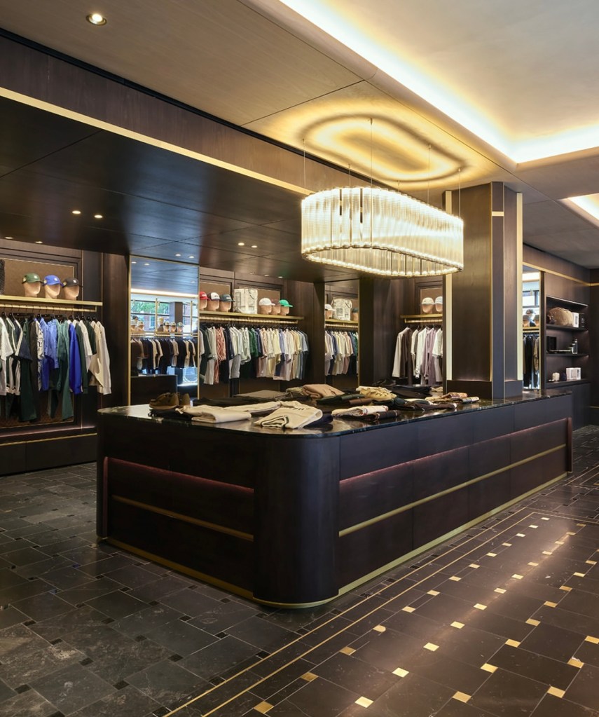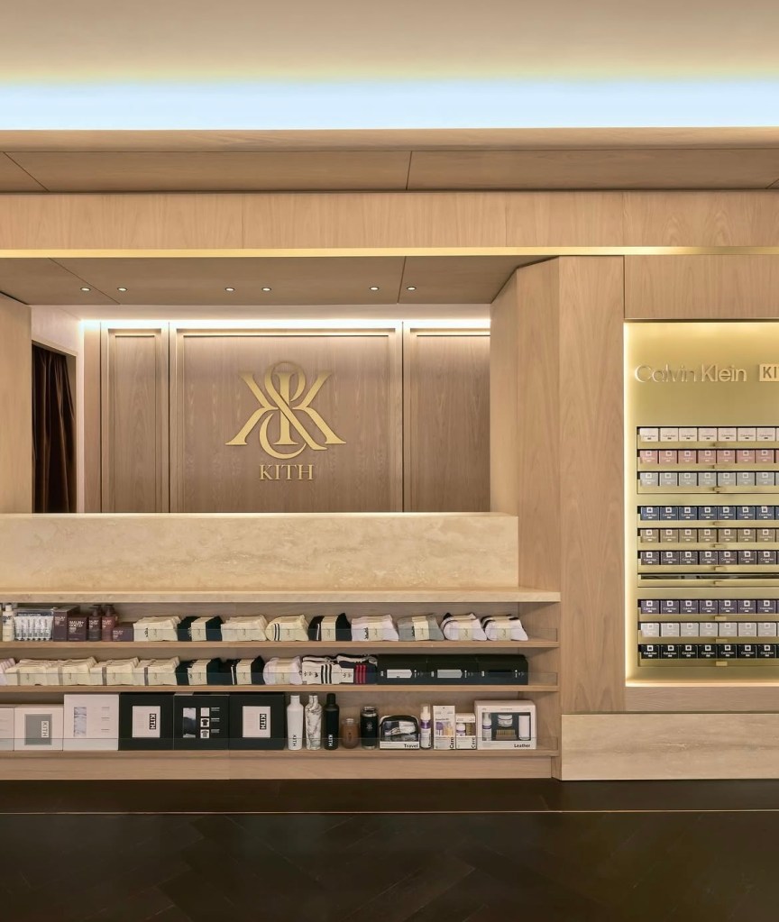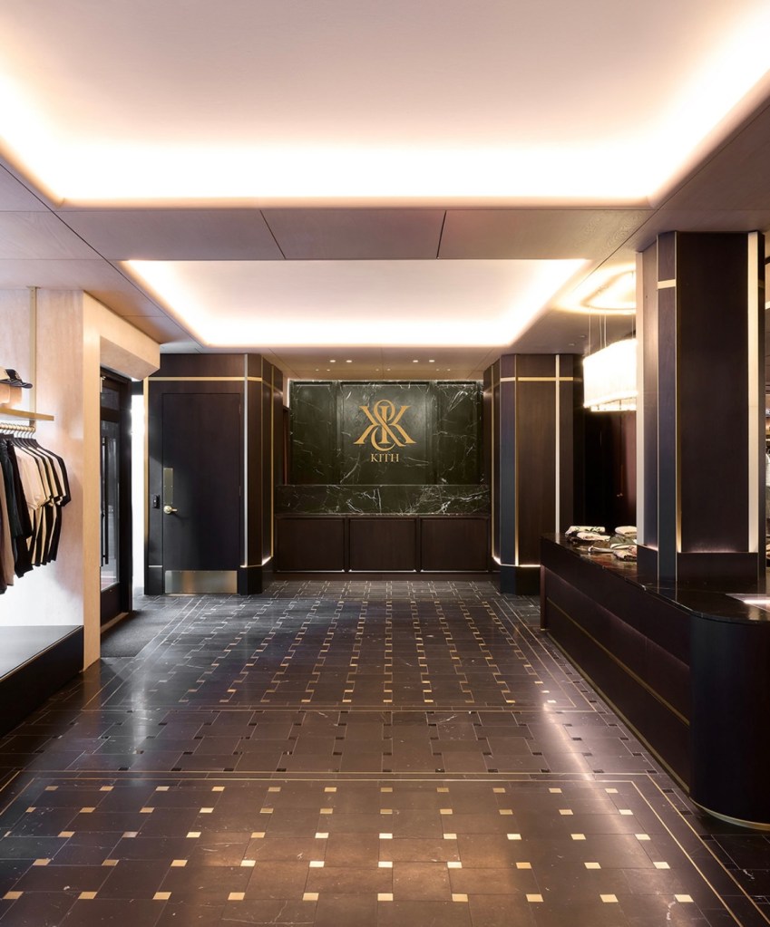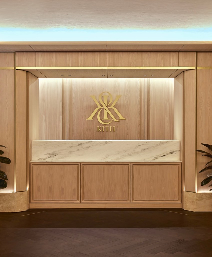 - Rez-de-chaussée : l’univers Kith Men’s s’expose dans un décor sophistiqué mêlant chêne blanc, laiton satiné et marbre. Les collections sont présentées avec élégance sur des étagères encastrées en cuir et des murs en noyer sombre.
