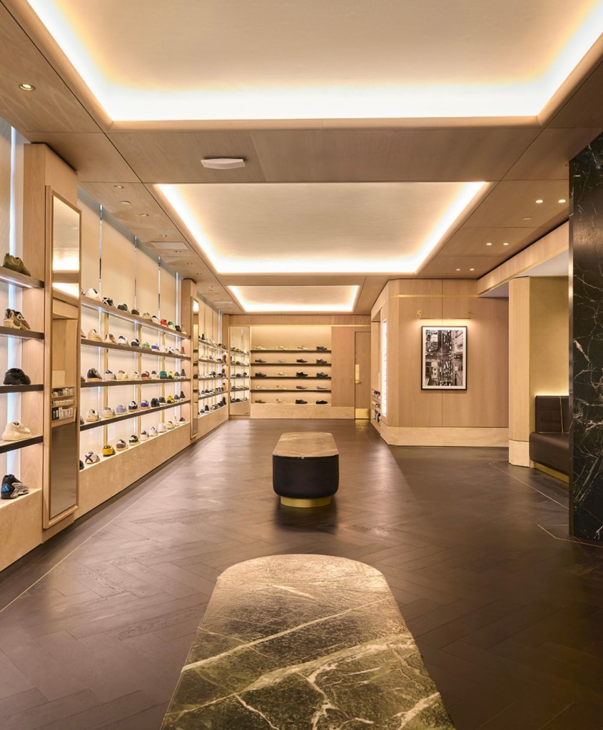 - 2e étage : une synthèse des deux précédents, dédié entièrement à l’univers footwear, avec des bancs en marbre et en noyer pour prolonger l’expérience haut de gamme.