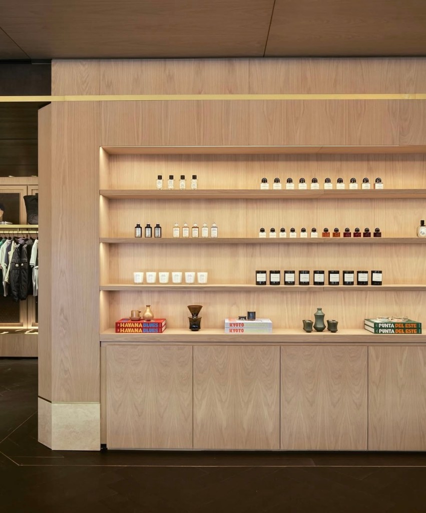 - 1er étage : place à une sélection pointue de marques, où le noyer en chevrons rencontre des murs en chêne blanc. L’ambiance se veut plus lumineuse, mais toujours raffinée.