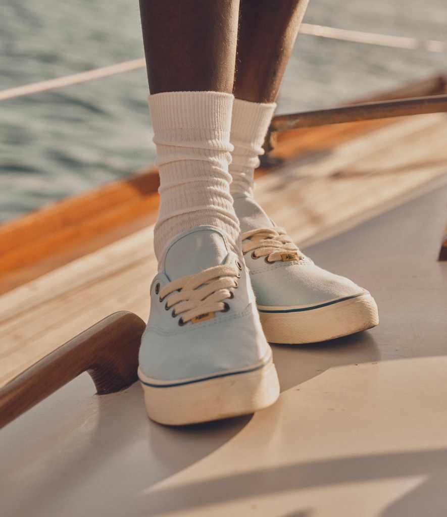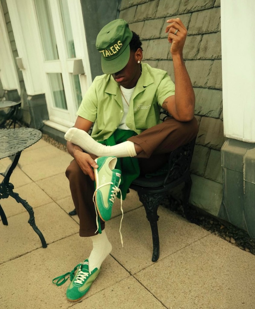 Deux paires en tête d’affiche : la Naut-1, une version modernisée du bateau classique avec une touche universitaire chic, et la Coach Jogger, inspirée des baskets de course des années 70, conçue à l’origine pour les pistes olympiques de 1976. L’une flirte avec le vestiaire preppy, l’autre convoque l’esprit des runnings rétro — le tout réinventé avec des palettes de couleurs et des détails typiques du style Tyler.