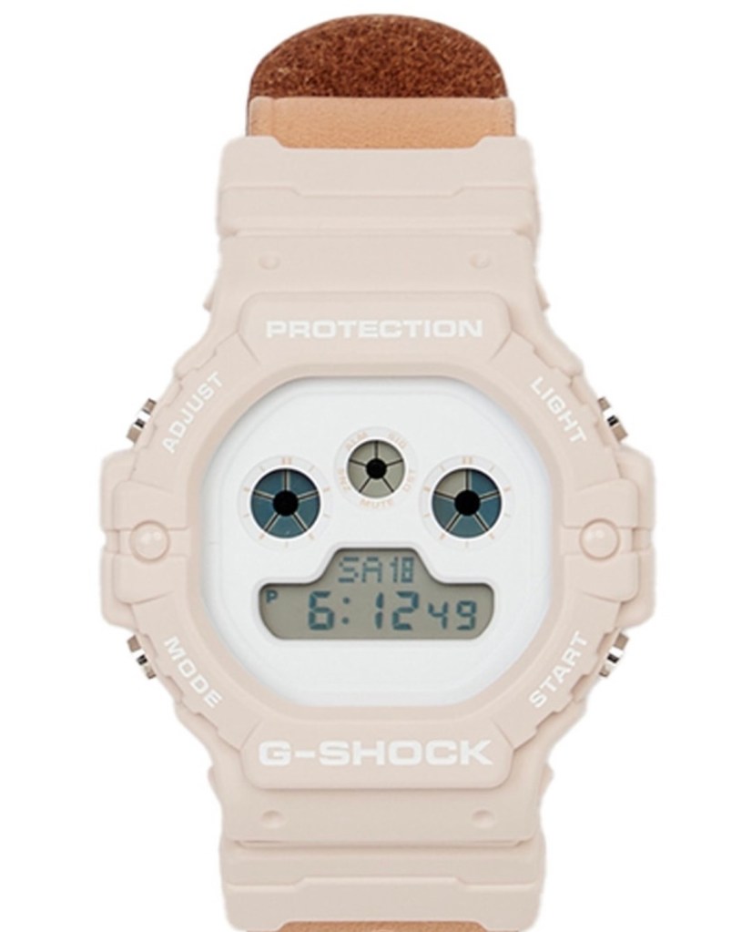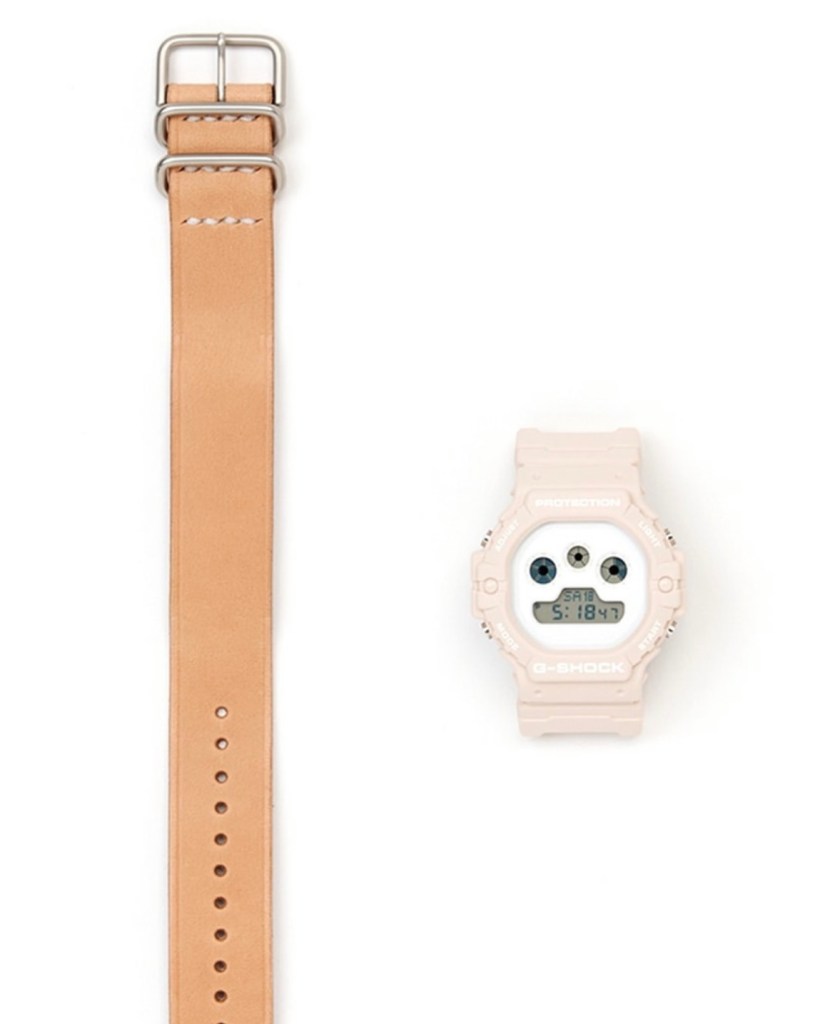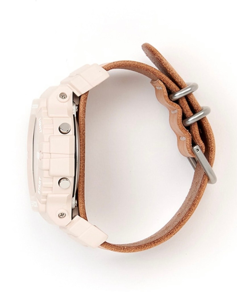 Le DW-5900, surnommé « trois yeux » pour ses trois cadrans circulaires, se pare d’un boîtier en résine beige clair et d’un cadran blanc épuré. Le bracelet en cuir de vachette, tanné végétalement et cousu main, est conçu pour développer une patine unique au fil du temps, rendant chaque pièce singulière. Un bracelet en résine interchangeable est également inclus pour une utilisation plus sportive.