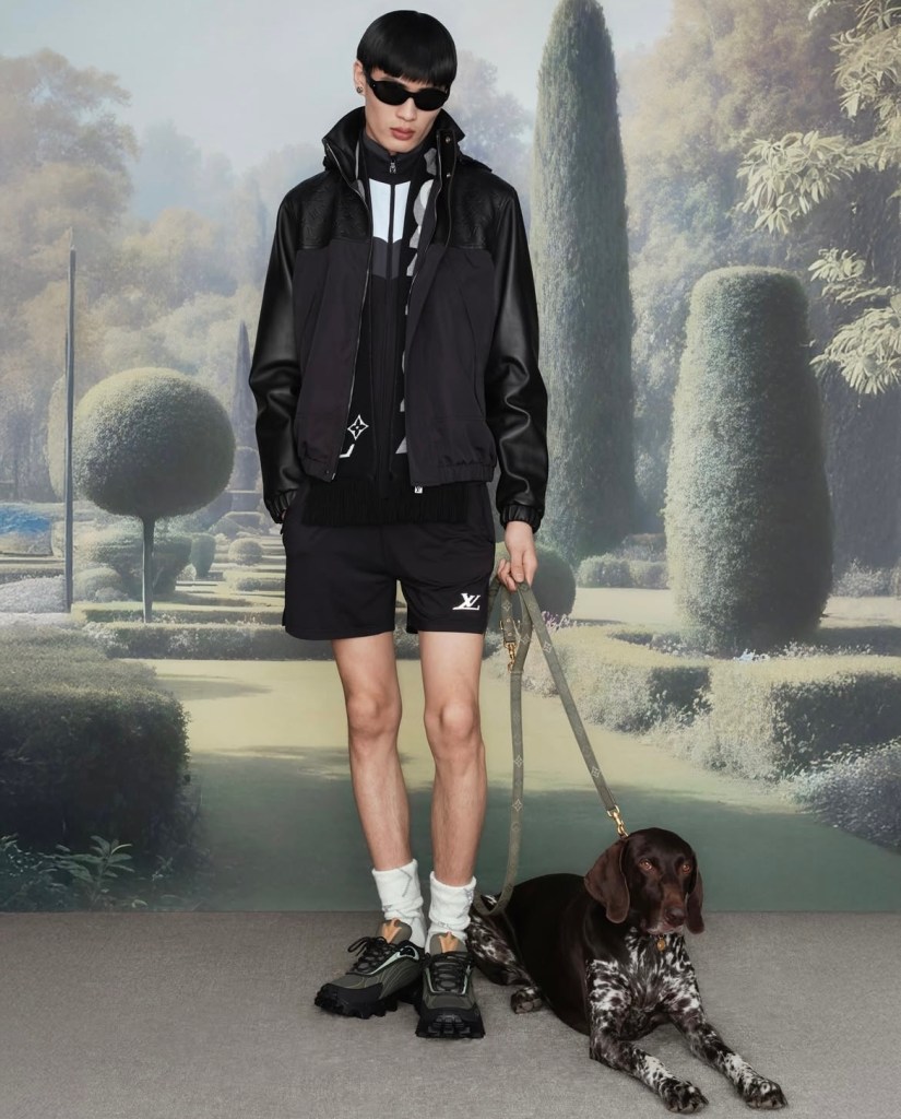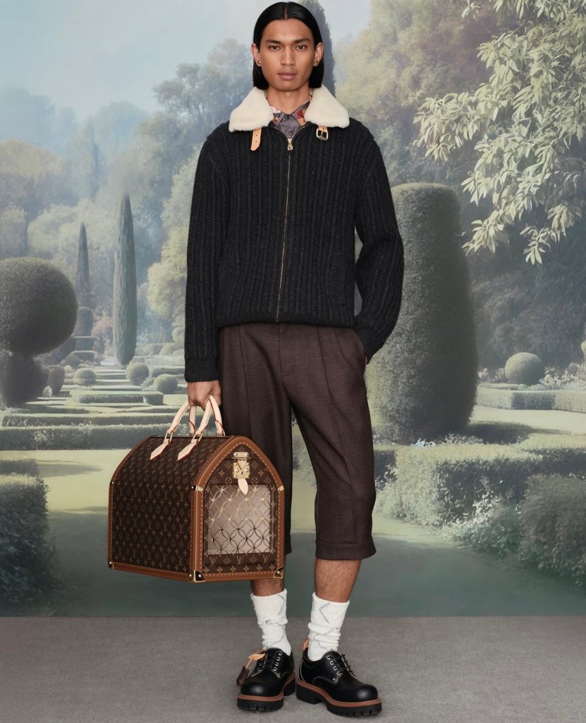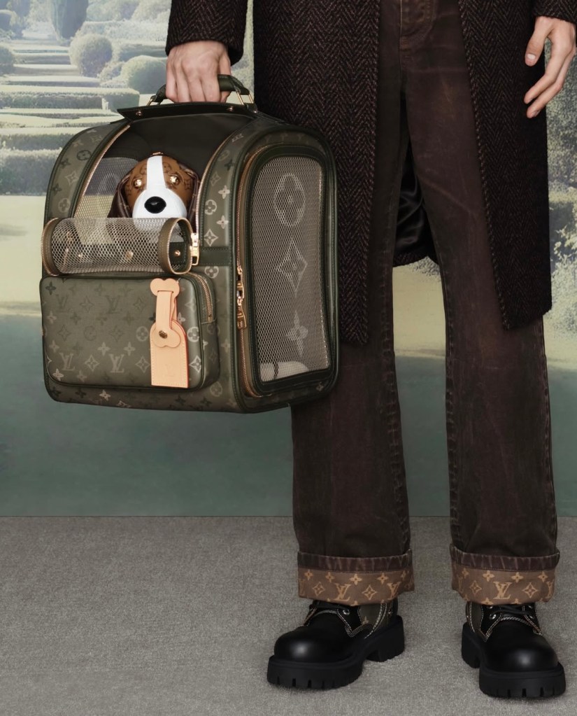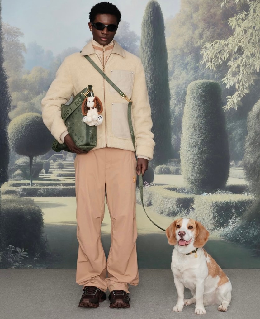 La collection déborde de détails ultra travaillés : ceintures façon malle vintage, brogues cloutées, lunettes sculpturales… Même les chiens ont droit à leur moment de gloire, avec accessoires et sacs dédiés. Pharrell pousse le lifestyle jusqu’au bout.