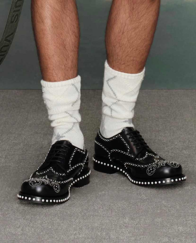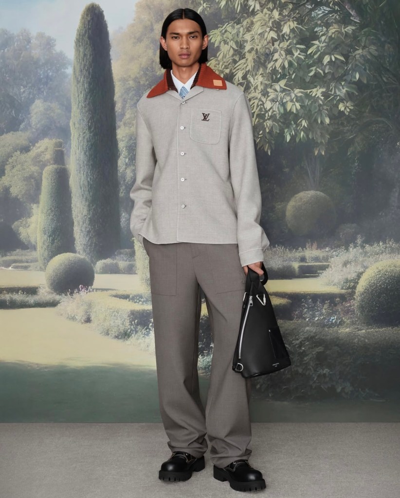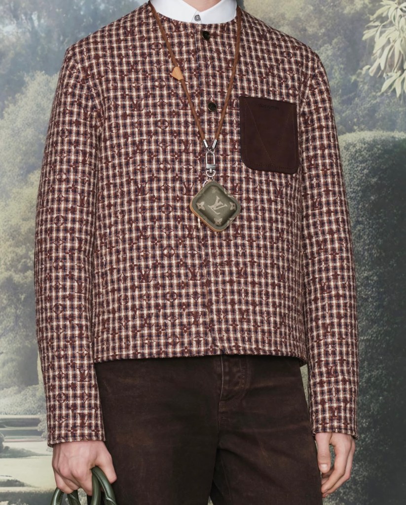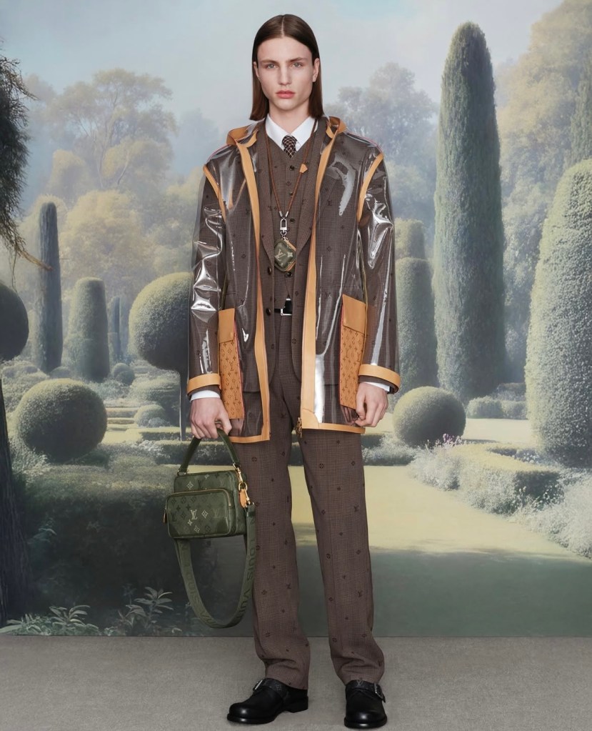 La collection déborde de détails ultra travaillés : ceintures façon malle vintage, brogues cloutées, lunettes sculpturales… Même les chiens ont droit à leur moment de gloire, avec accessoires et sacs dédiés. Pharrell pousse le lifestyle jusqu’au bout.
