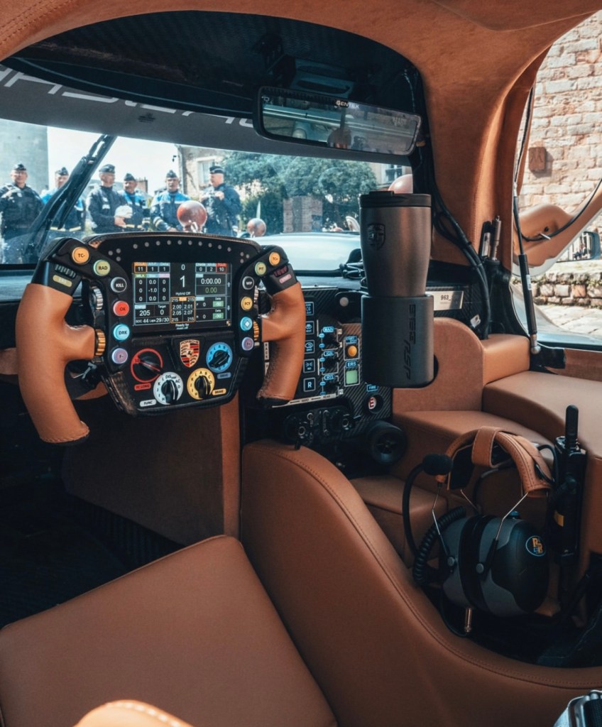 À bord, tout n’est que cuir fauve, Alcantara somptueux, finitions sur mesure. L’intérieur, qui troque l’austérité des circuits pour une ambiance grand tourisme, évoque la 917 sans jamais tomber dans la nostalgie muséale. Chaque détail respire le sur-mesure, jusqu’au compartiment conçu pour un casque assorti — objet de style en soi.