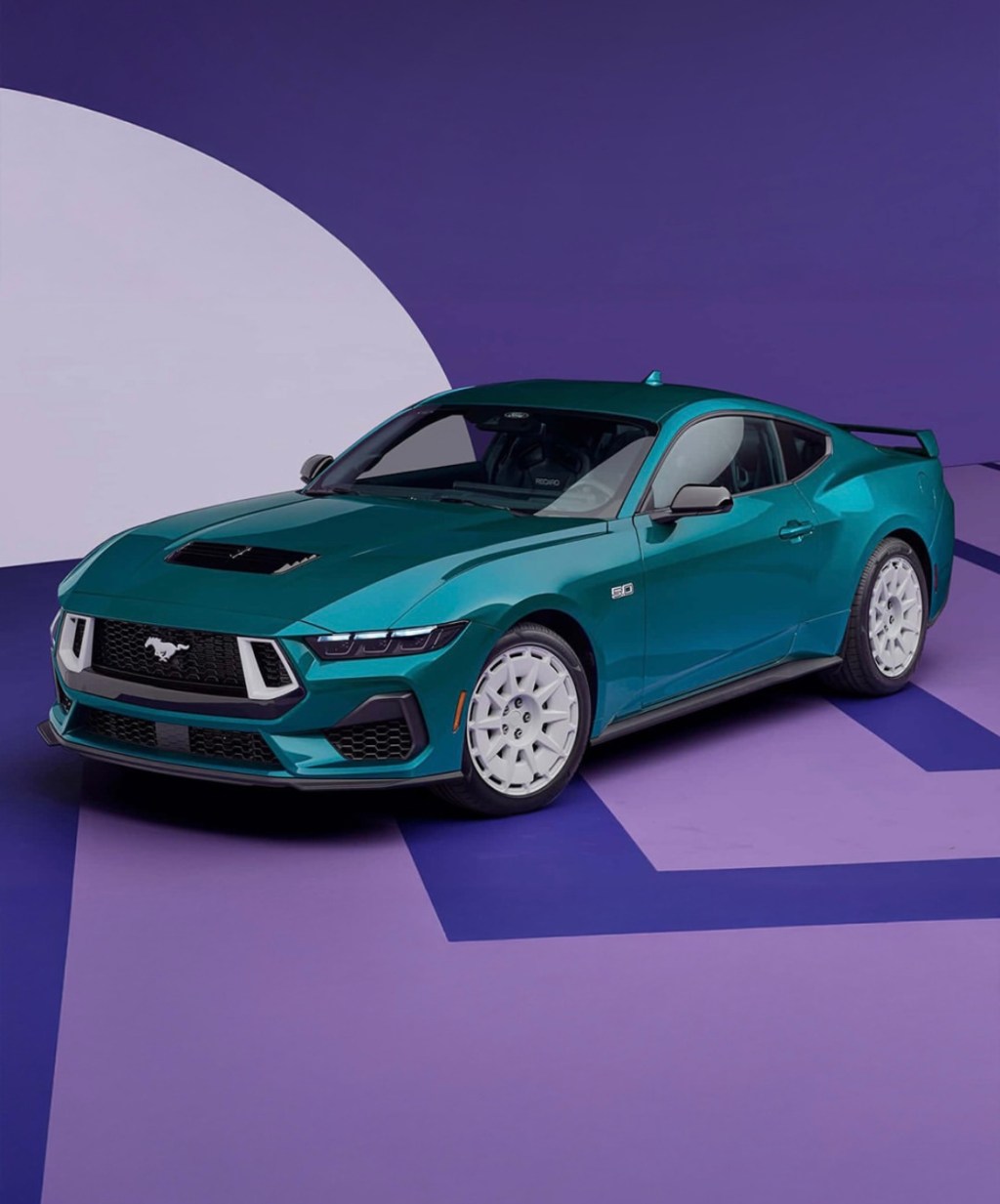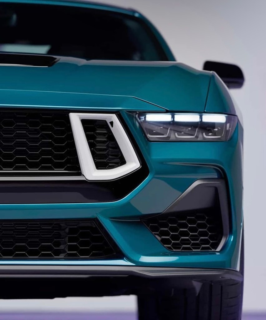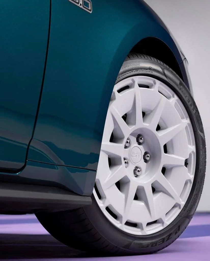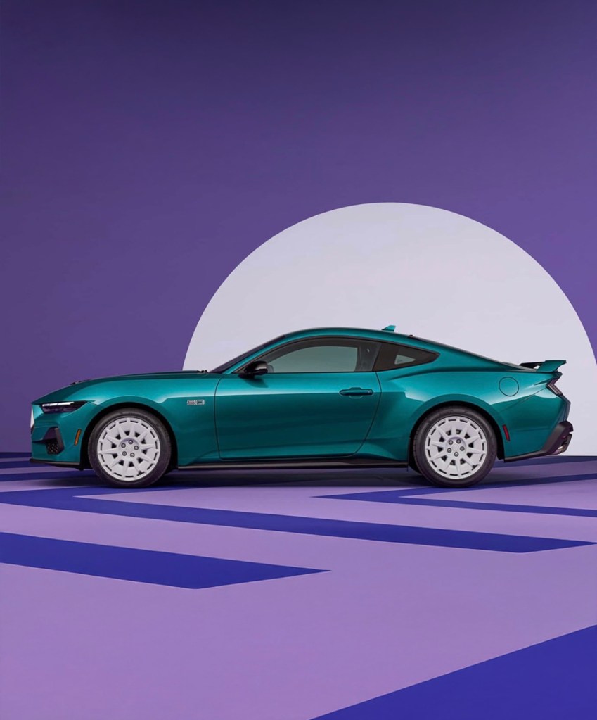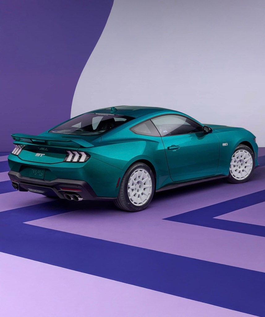 La pièce maîtresse ? La peinture Adriatic Blue Metallic, un bleu‑vert vibrant repris du catalogue couleur des Mustang Fox‑body. Cette teinte est magnifiée par des jantes de 19 pouces peintes en Oxford White, disponibles en deux styles selon que le pack Performance est choisi ou non. Les touches blanches se retrouvent sur les badges 5.0, le lettrage “Mustang”, les entourages de feux arrière et même les “naris” avant pour la version Performance.