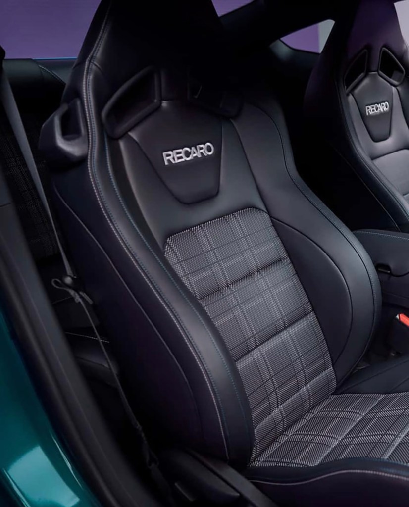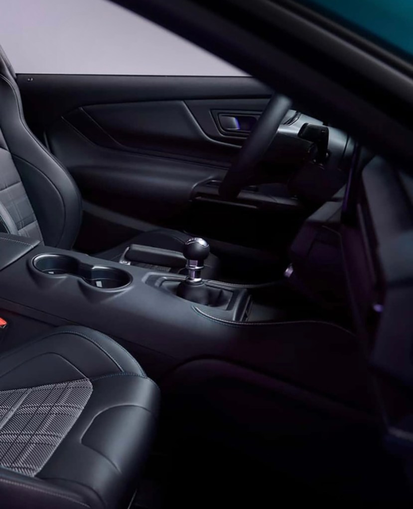 À bord, Ford injecte une dose de nostalgie : inserts en cuir perforé façon plaid, hommage direct aux Fox‑body d’époque. Les sièges Recaro en option, ou les sièges standard, s’habillent de ces motifs, tandis que l’habitacle est rehaussé de surpiqûres argent et bleu Adriatic aux portes, sièges, console, volant… et se conclut par un badge FX sur la planche de bord .