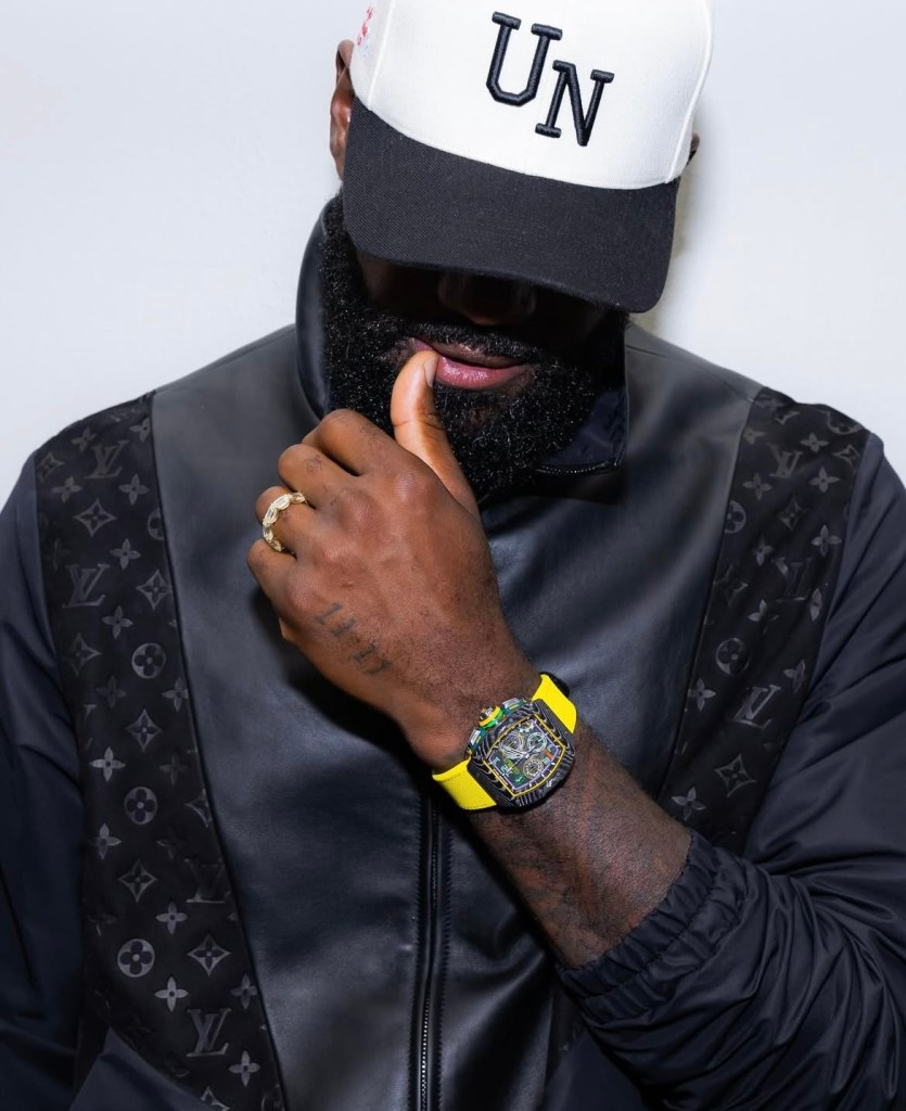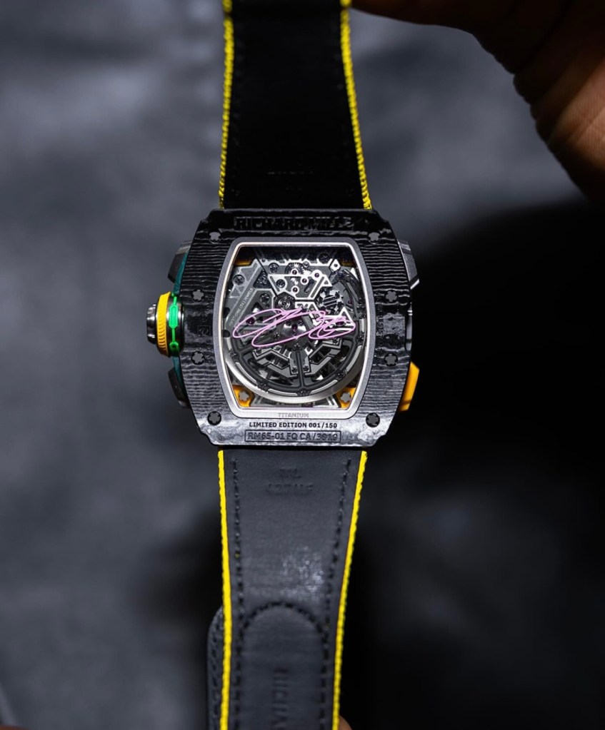 Ce modèle unique en son genre — limité à seulement 150 exemplaires — fusionne les codes esthétiques des Lakers et l’exigence technique propre à la maison Richard Mille. Le boîtier en Carbon TPT® est rehaussé par un insert en Quartz TPT jaune, ponctué d’accents verts et violets qui rappellent les couleurs mythiques de l’équipe de Los Angeles. Un bracelet jaune éclatant vient compléter l’ensemble, tandis que la couronne arbore la signature emblématique de LeBron à midi. À l’arrière, sa signature est gravée en violet sur le fond en saphir, comme un sceau royal.